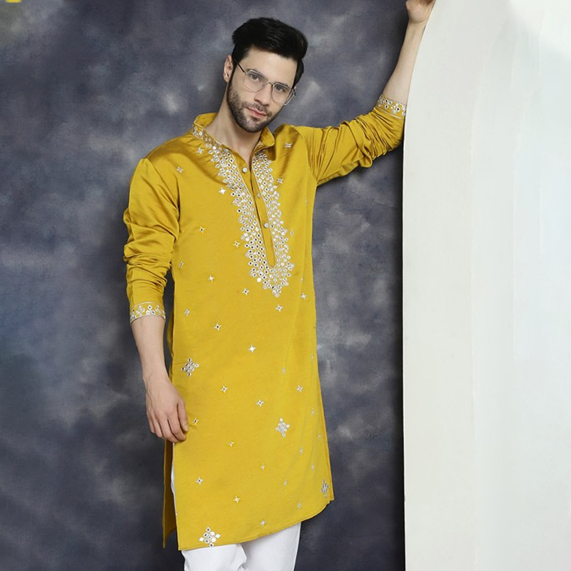 Geometric Embroidered Mandarin Collar Mirror Work Cotton Silk Straight Kurta
