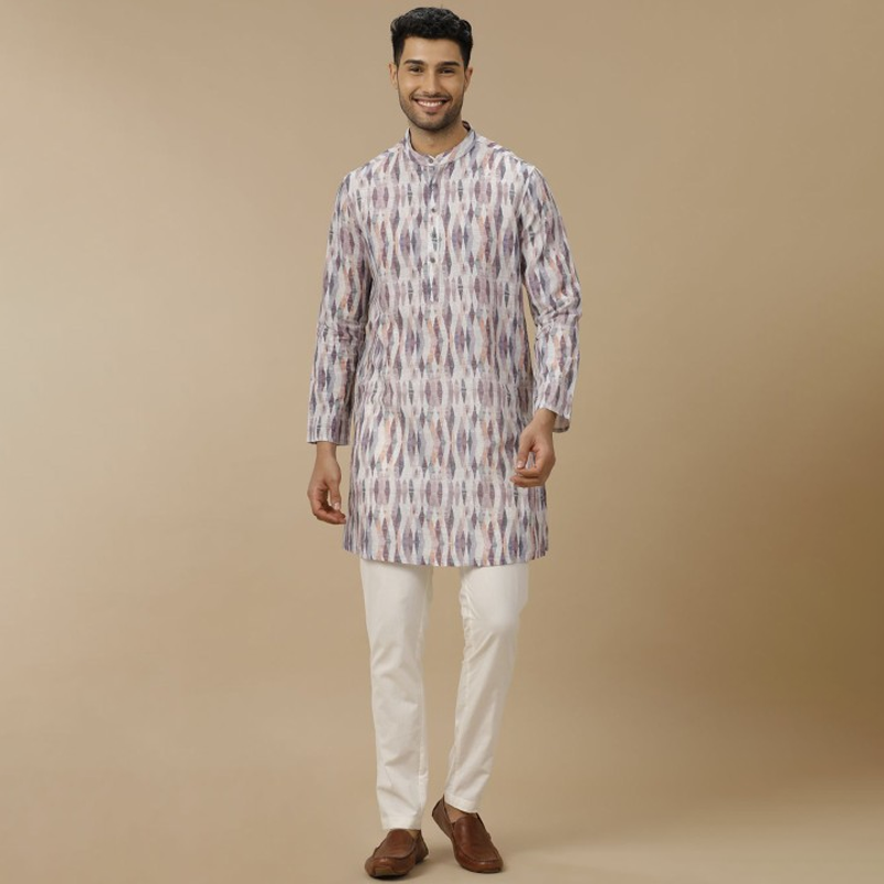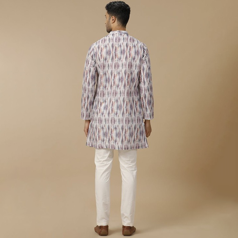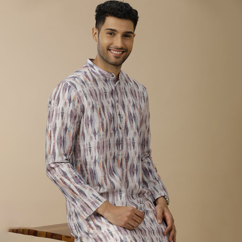 "Colour: purple & beige Geometric printed Mandarin collar Long, regular sleeves Straight shape with regular style Knee length with straight hem Machine weave regular linen Size & Fit The model (height 6') is wearing a size M Material & Care Linen Cotton Machine Wash"