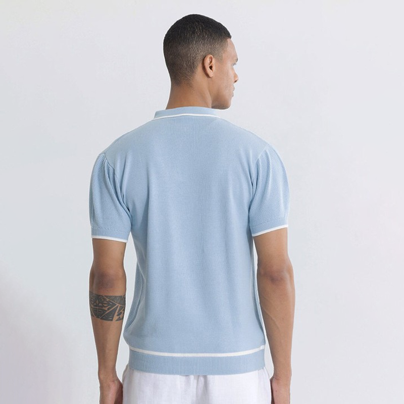 Blue t-shirt for men Self design Regular length Polo collar Short, regular sleeves Cotton fabric Zip closure Size & Fit Slim Fit The model (height 6') is wearing a size M Material & Care 100% Cotton Machine Wash