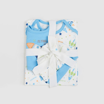 This baby apparel gift set consists of 1 bodysuit, 1 beanie, and a bib