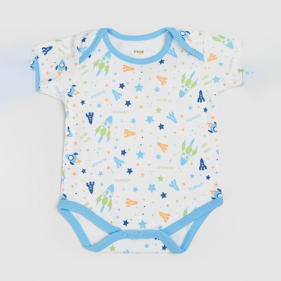 White, blue and green printed bodysuit, has an envelope neck, short sleeves, snap-button closures along the crotch