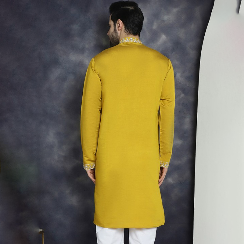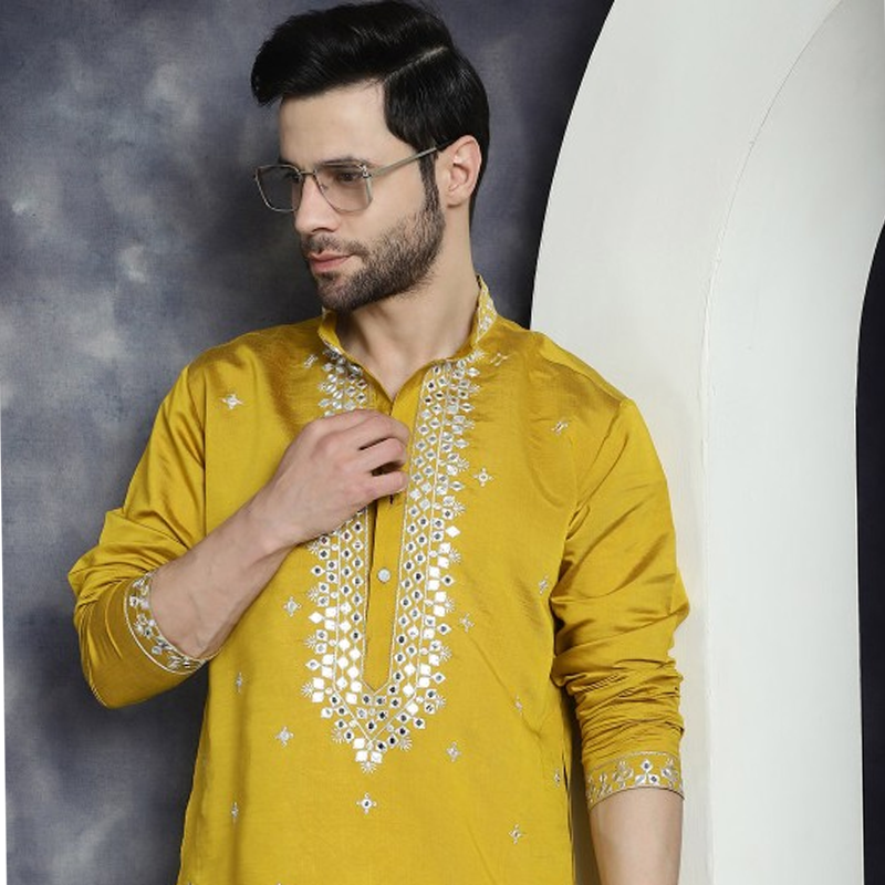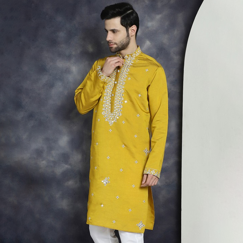 "Colour: mustard yellow Geometric Embroidered Mandarin collar Long, regular sleeves Straight shape with regular style Mirror Work detail 2 Pockets knee Length with straight hem Machine weave regular cotton silk Size & Fit The model (height 6') is wearing a size M Material & Care 50% Cotton 50% Silk Machine Wash"