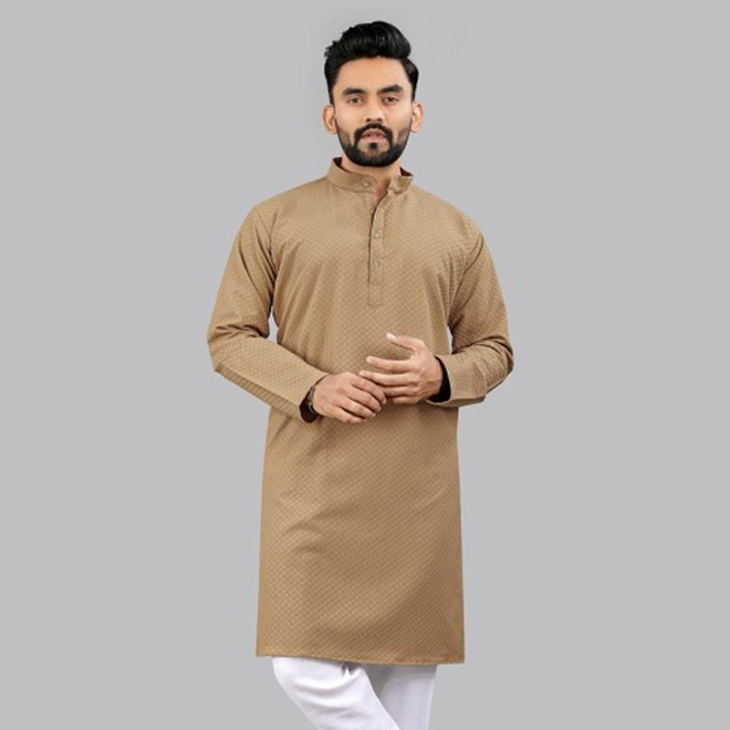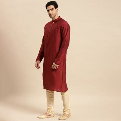 "Beige and maroon sherwani set Beige woven design sherwani, has a mandarin collar, a full button placket, long sleeves, straight hem, and multiple slits Maroon solid kurta, has a mandarin collar, half button placket, long sleeves, a straight hem, and side slits Beige solid churidar has a drawstring closure Comes with a pocket square Size & Fit Regular Fit The model (height 6"") is wearing size M Material & Care Cotton Dry Clean"