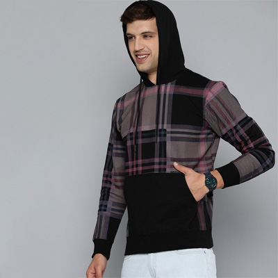 "Black checked sweatshirt has a hood, 1 kangaroo pocket, long sleeves, ribbed hem