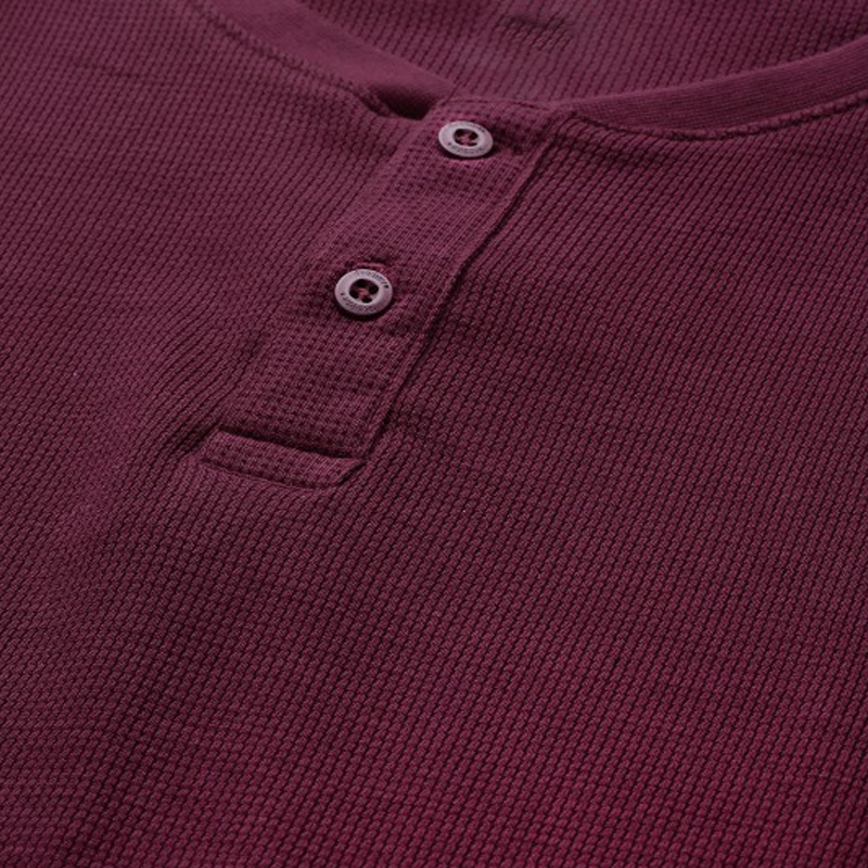 Burgundy solid T-shirt, has a Henley neck, long sleeves, button closure