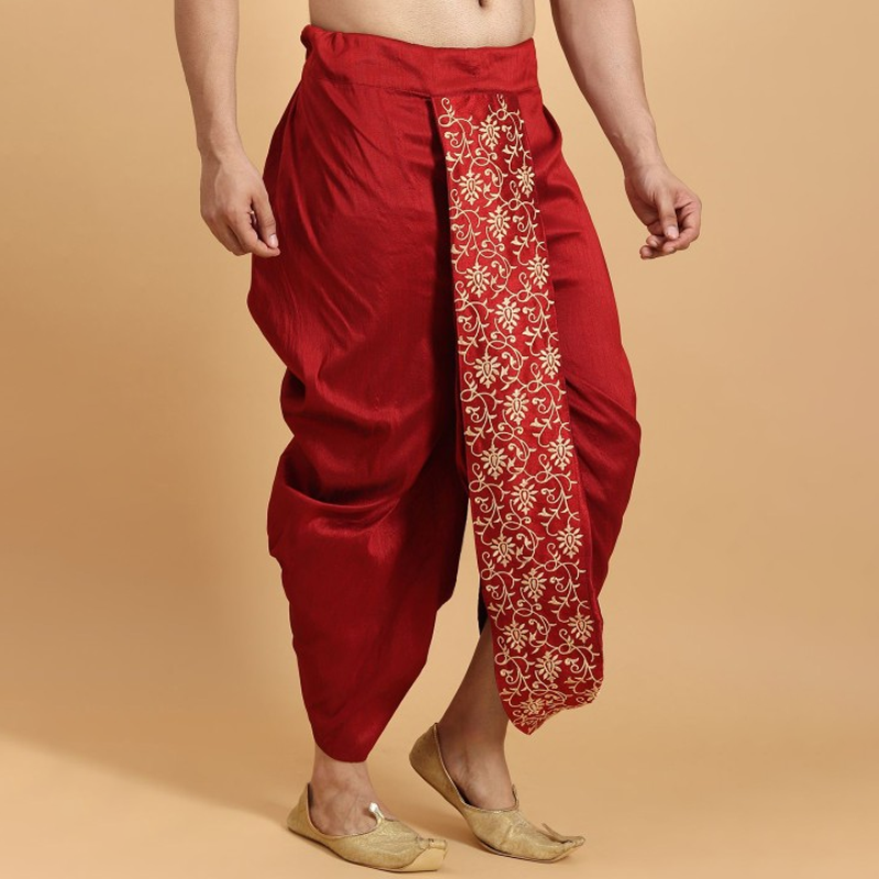 "A pair of solid mid-rise dhoti pant with pleated and gathered detail, has an elasticated waistband, and slip on closure Size & Fit The model (height 6') is wearing a size 44 Material & Care 80% Silk & 20% Polyester Hand Wash"