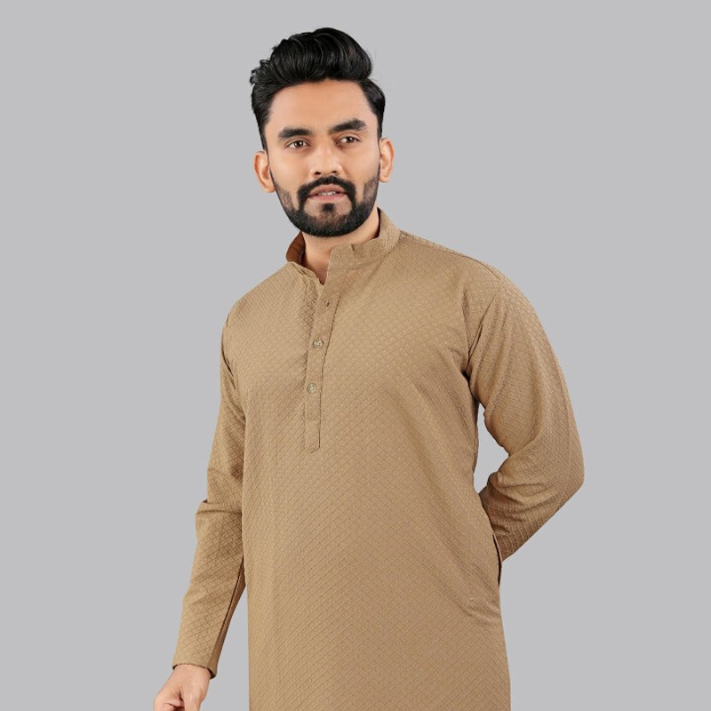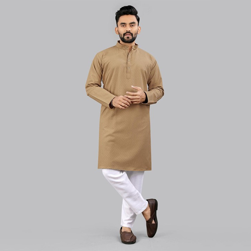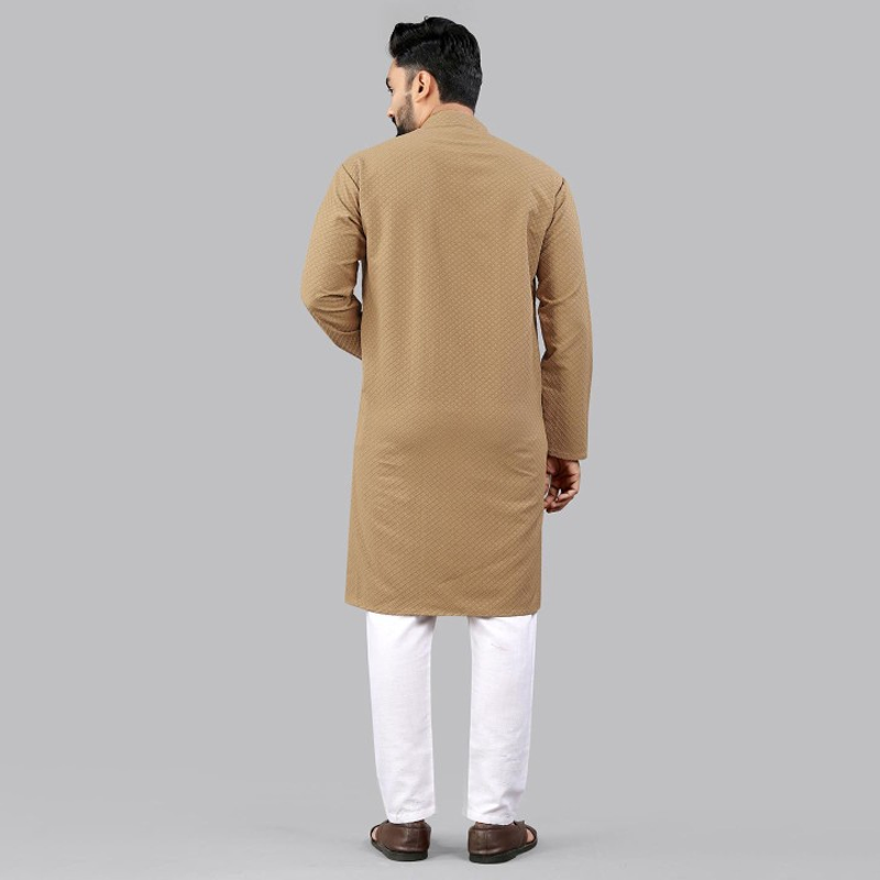 "Colour: beige Abstract embroidered Mandarin collar Long, regular sleeves Straight shape with regular style Knee length with straight hem Machine weave regular cotton Size & Fit 1 The model (height 6') is wearing a size M Material & Care Wash Care: Regular Machine Wash. Use Mild detergent or Soap. Wash Dark Colors Separately in cold water as dark colors may bleed into light colored clothes."