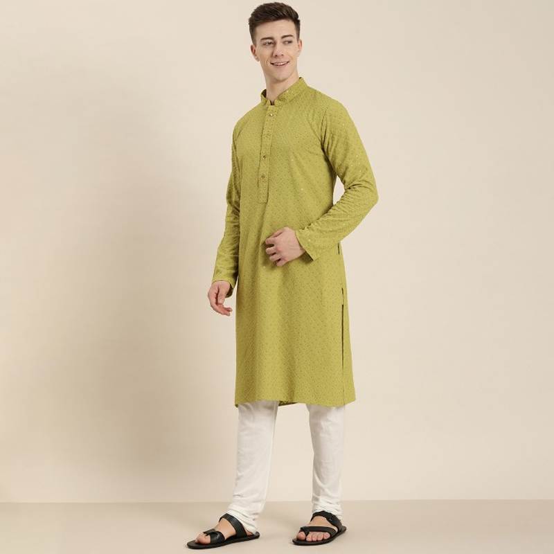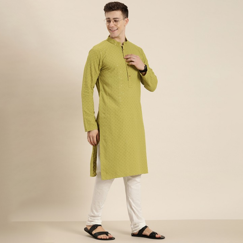 "Colour: lime green Ethnic motifs embroidered Mandarin collar Long, regular sleeves Straight shape with regular style Chikankari detail Knee length with straight hem Machine weave regular viscose rayon Size & Fit Size worn by the model: M Chest: 36"" Height: 5'11"" Material & Care Fabric: Rayon Hand Wash"