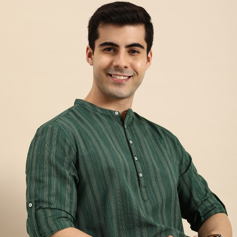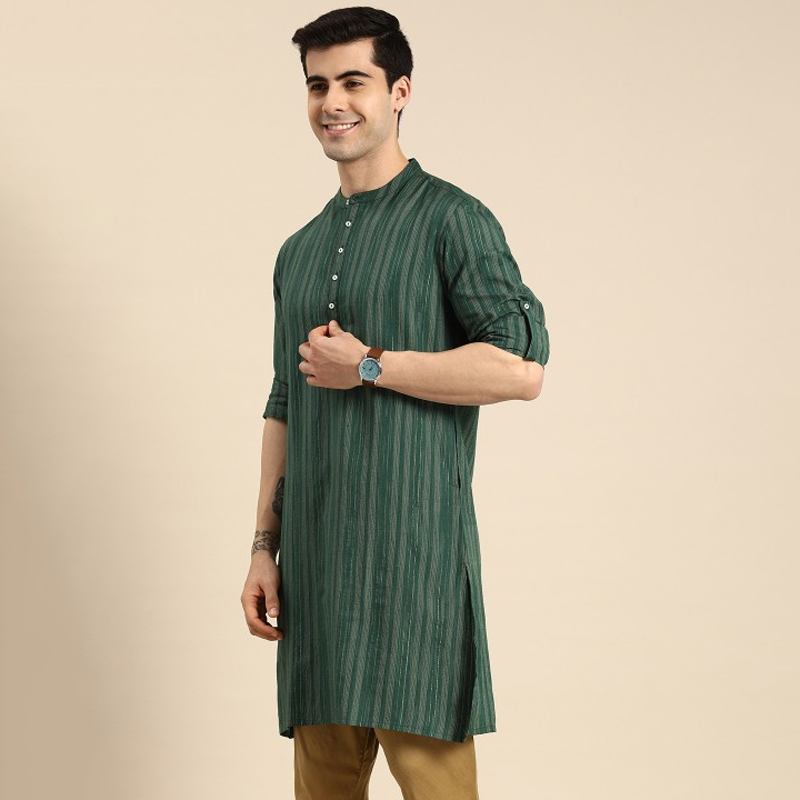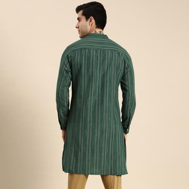 "Colour: green and gold-toned Striped Mandarin collar Long, roll-up sleeves Straight shape with regular style Knee length with straight hem Machine weave regular cotton 2 pockets Size & Fit Size worn by the model: 40 Chest: 40"" Height: 6' Material & Care 60% Cotton 39% Polyester 1% Metalised Hand wash"