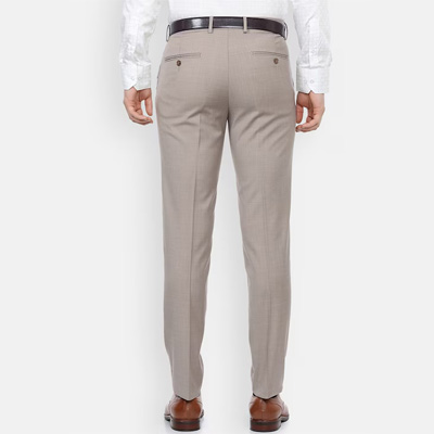 "Khaki knitted formal Slim fit Mid-rise Length: regular Pattern: solid Flat-front, with no pleats design Feature: plain 4 pockets Size & Fit Fit: Slim Fit The model (height 6') is wearing a size 32 Material & Care 64% Polyester, 34% Wool, and 2% Elastane Machine wash"