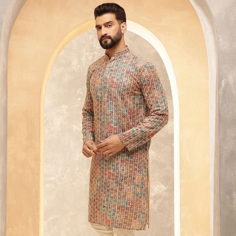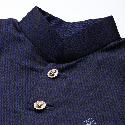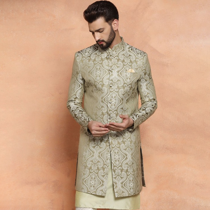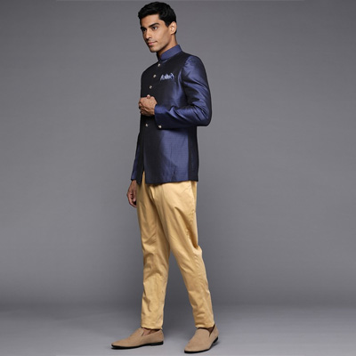 "This sherwani set consists of a Sherwani with salwar Navy blue woven design Sherwani, has a mandarin collar, long sleeves, button placket, three pockets, side slits, attached pocket square, and a straight hem A pair of golden solid mid-rise pyjamas, has drawstring fastening Size & Fit Size worn by the model: M Chest: 40"" Waist: 33"" Hips: 37"" Height: 6'1"" Material & Care Sherwani fabric: Silk Blend Bottom fabric: Cotton Blend Dry Clean"
