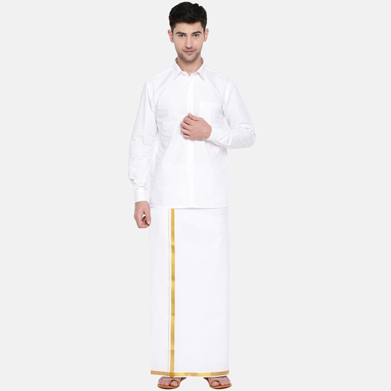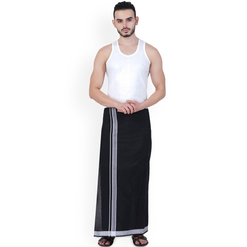 "Pack of 2 dhoti Green solid dhoti has gold zari border Beige solid dhoti has gold zari border Size & Fit Dimension of dhoti: 1.27 m x 2 m(Length x Width) Material & Care 100%Cotton Machine wash"