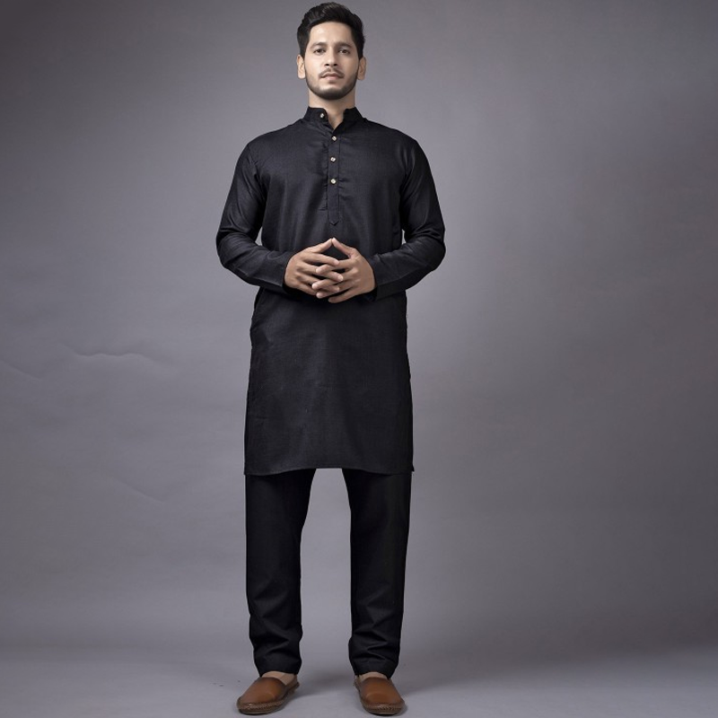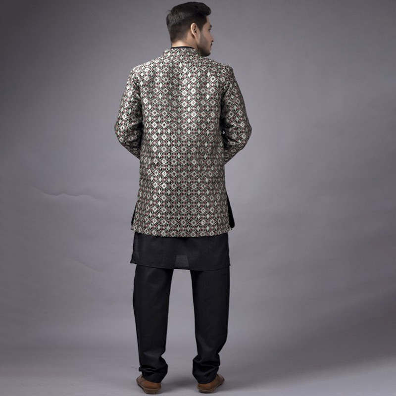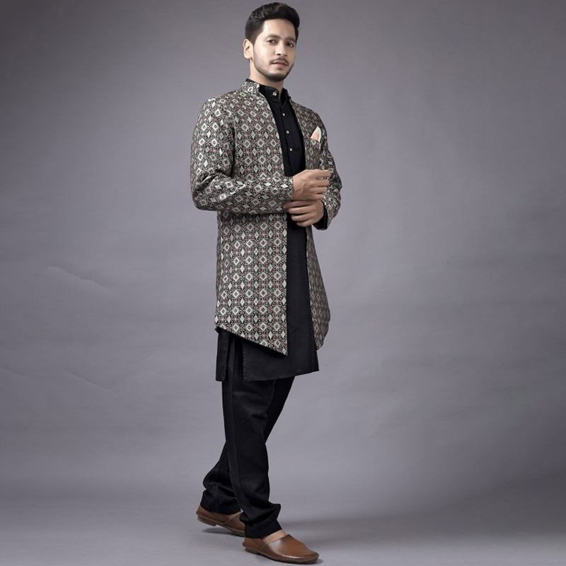 "Black printed sherwani set Black Printed sherwani, has a mandarin collar, stylised wrap-over front with button closures, long sleeves, one welt pocket and multiple slits Black solid kurta, has a mandarin collar, a short button placket, long sleeves and side slits Black solid Pyjamas has a partially elasticated waistband with belt loops, button closure Size & Fit The model (height 6') is wearing a size S Material & Care Silk Blend Dry Clean"