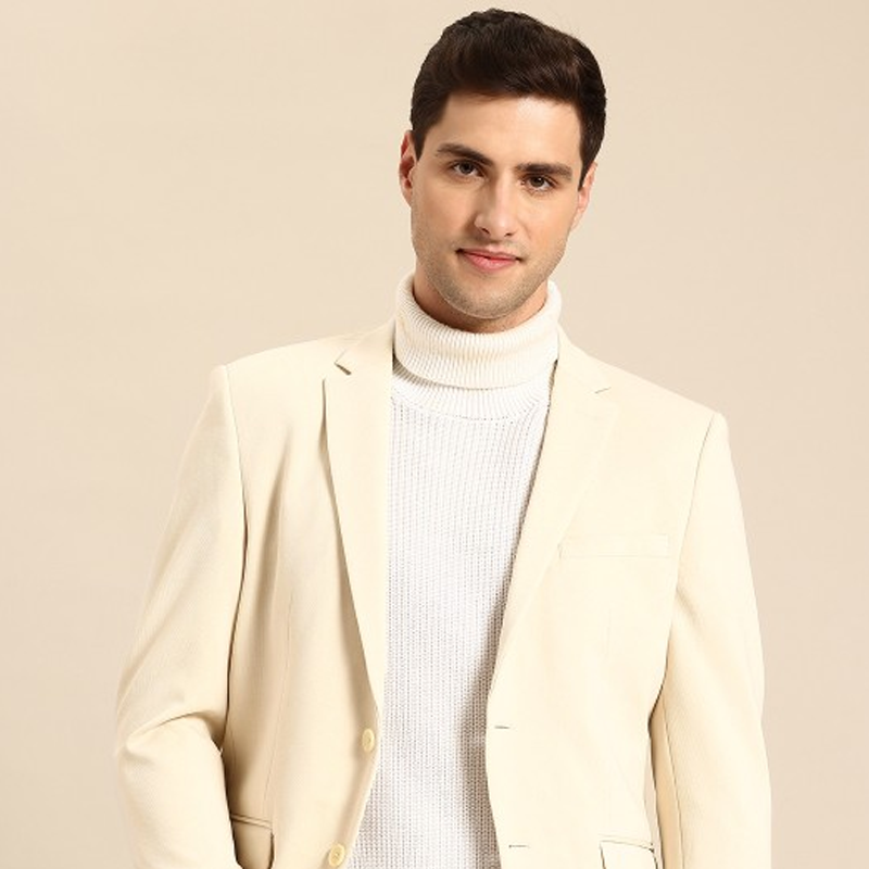 "Beige casual blazer, has a notched lapel collar, single-breasted with button closure, structured shoulder, 5 pockets, and a double vented back hem Size & Fit Size worn by the model: m Chest: 40"" Height: 6'2"" Material & Care Shell: 97% Polyester, 3% Elastane Lining: 100% Polyester Dry clean"