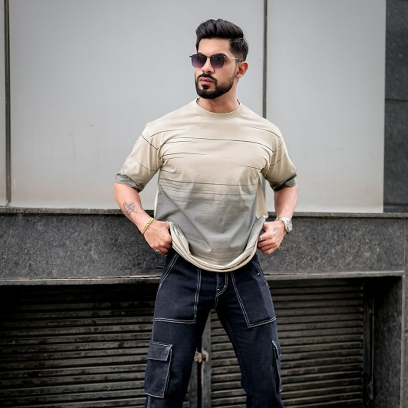 Beige Tshirt for men printed Longline length Round neck Short, regular sleeves Knitted cotton fabric Size & Fit Oversized The model (height 6') is wearing a size M Material & Care Cotton Machine Wash